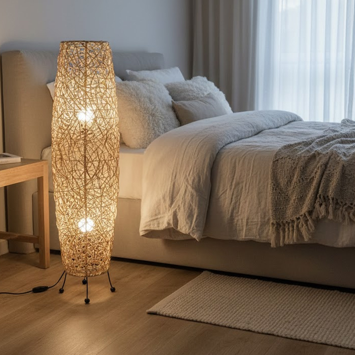 当店オリジナルデザインのラタン製スタンドランプ(L)は、その美しい造形と、天然素材が持つ卓越した機能性で、あなたの空間に極上のリラックスタイムをもたらします。