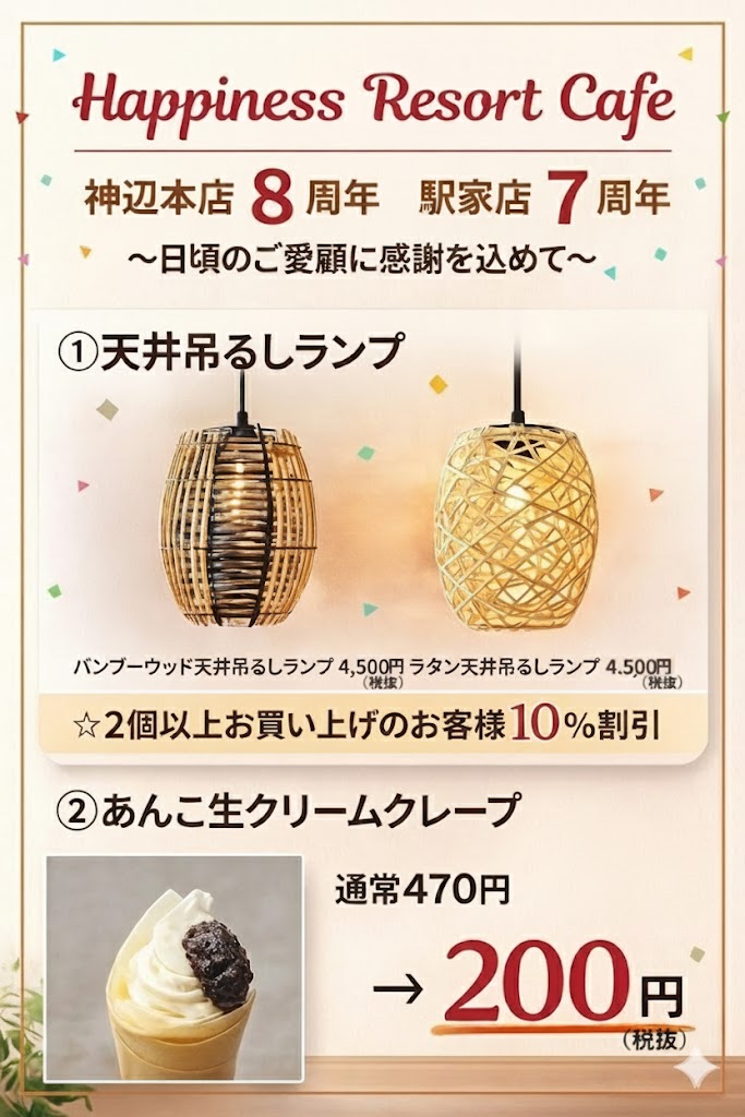 こんにちは!ハピネスリゾートカフェです。 この度Hapiness Resort Cafe 神辺本店8周年✨駅家店7周年✨を迎えます‼ いつも当店をご利用して下さるお客様のおかげです❣ 日頃の感謝の気持ちを込めて感謝フェア...